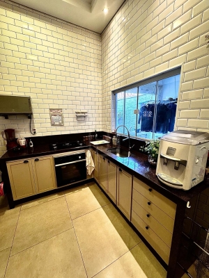 ? Ambientes integrados: sala de TV, sala de jantar e cozinha com pé-direito duplo