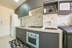 * Cozinha planejada com armários cinza fosco, cooktop e forno embutido